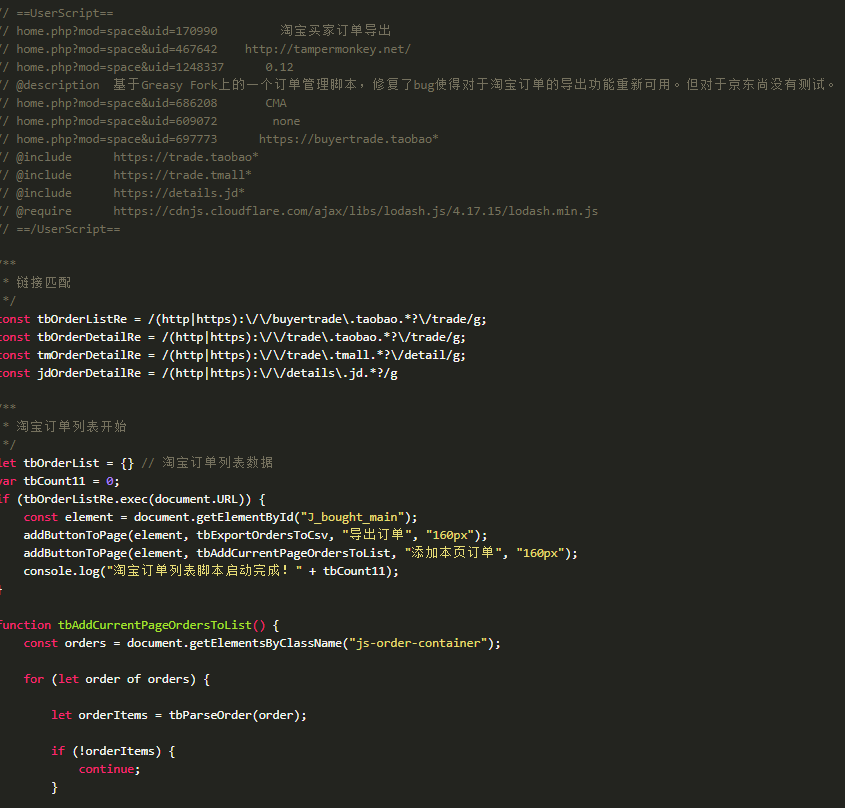 基于Greasy Fork上的一个订单管理脚本,修复了bug使得对于淘宝订单的导出功能重新可用。但对于京东的订单尚没有测试。