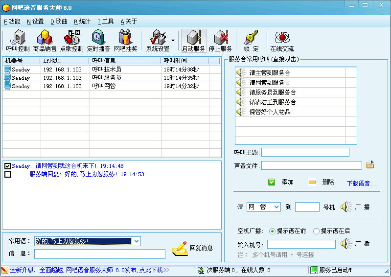 本程序主服务端具有强大的设置功能,能根据你网吧的实际情况,设置你自己的呼叫方案;可以进行有声、无声、真人发声等各种类型的呼叫;可以根据网吧实际情况,自由设置客户端显示的相关功能;可以正确的报出任意长度、任意数字字母组合的机器号或分区号;可以设置各种定时播音;可以发送各种消息和公告;可以在服务端批量审核批准客户端上传的歌曲;客户端可以自动显示服务端上的商品图片;可以对在线机号、会员卡号进行抽奖;本软件的所有设置和对客户端的控制,均在主服务端上进行,客户端程序不需要作任何设置,非常方便网吧进行集中式管理!