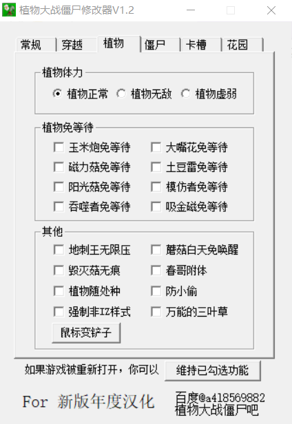 修改器是一款专业的辅助工具,它的功能十分强大,拥有包括修改无限阳光、无限金钱、掉落物品自动收集、花瓶透视、浓雾透视、直接跳关、开启小游戏特效等功能,感兴趣的朋友快来下载吧。