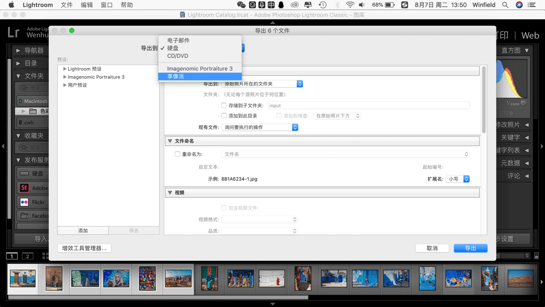 2、导出照片时,选择“导出”可导出到“享像派”,即能在享像派app和web后台中查看到精修图片