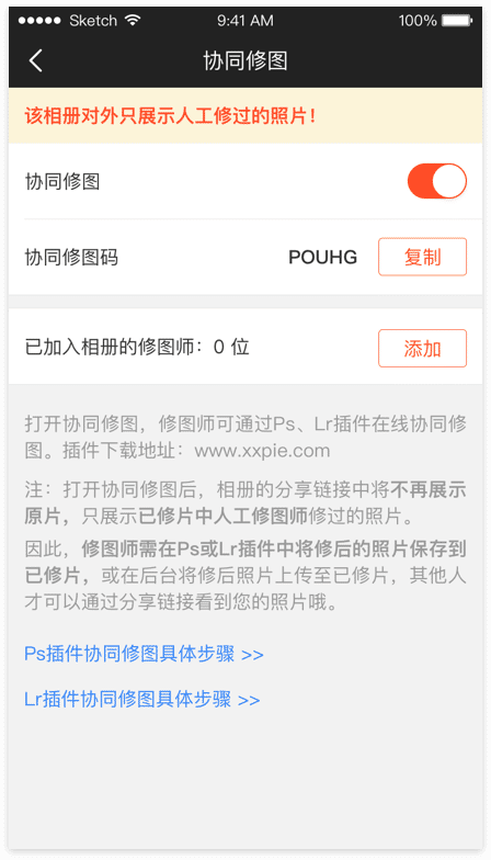 摄影师在相册设置中将“协同修图”开关打开,将协同修图码发给修图师。