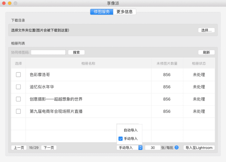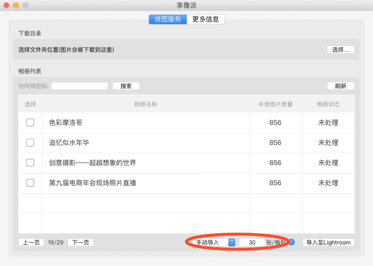 手动导入:按照设定的数量按批将照片导入至Lr,修完一批后需要在相册列表中重新勾选相册进行导入至Lr