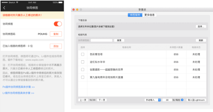 修图师输入“协同修图码”,查找需要修图的云相册,并加入工作台进行修图