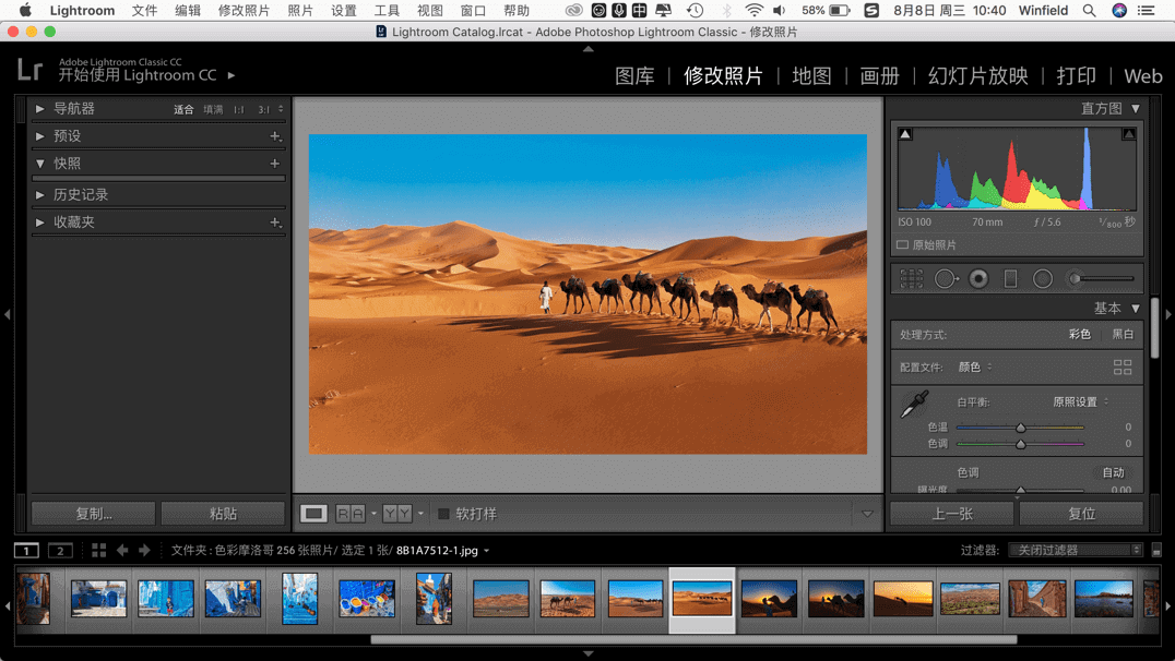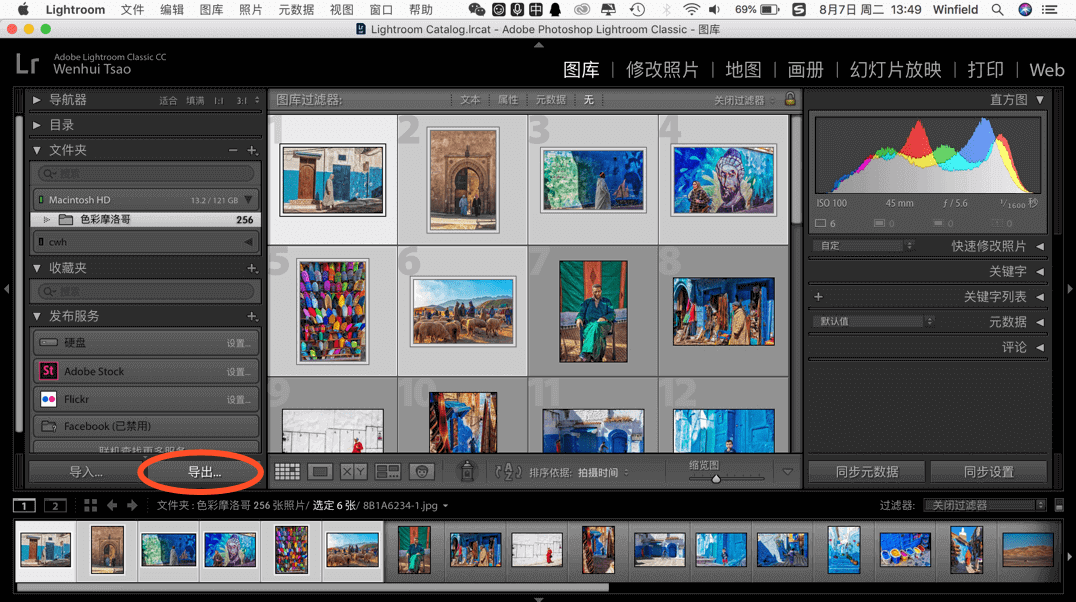 1、选定相册“导入至Lightroom”后,“图库”处会出现相应照片缩略图,在“修改照片”中进行修图操作