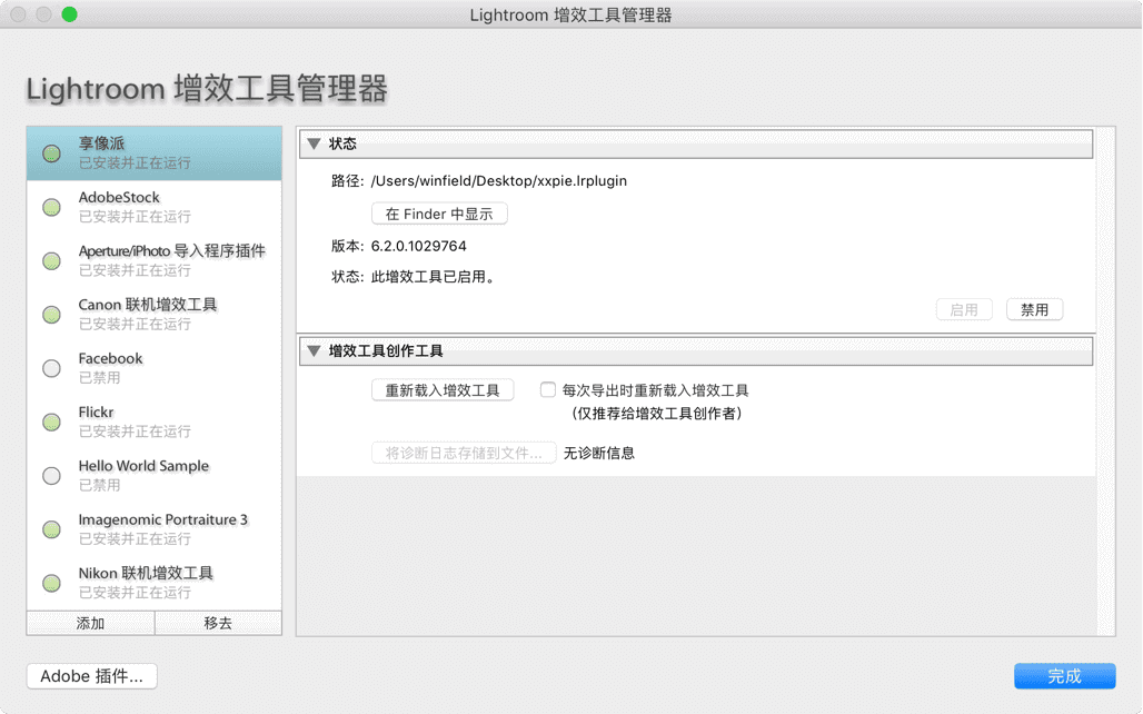 在增效工具管理器界面点击“添加”,找到解压后的LR插件,选择“xxpie.lrplugin”文件夹,点击“完成”,添加成功后如下图所示