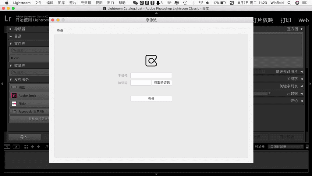 修图师从Lr的"增效工具管理器"菜单中打开“享像派Lr修图插件”,根据手机号码登录
