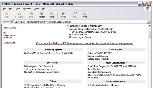 Belarc Advisor会扫描你计算机的数据,做出安全评估。你将会看到关于你计算机上软件和硬件等级的建议,并且列出一个详细的表。你计算机上的所有数据会受到保护,不会送到网络上的服务器。这个新版本会建议你计算机的最佳化报表。这个新版本增加了更多的系统型态。