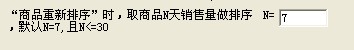 N天的销售量是指,如设置N为2天,即按这类商品中在2天时间内,谁销售量最大,这个“N”可以任意设置,你可以设置1天,即当天内谁的销售量最大,软件默认N=7,即7天的。这个“N”在软件“