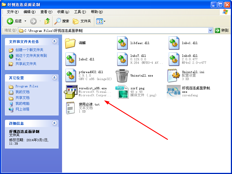 2、默认文件路径C:Program Files (x86)好视连连桌面录制系统vcredist_x86.exe