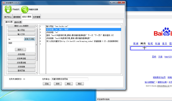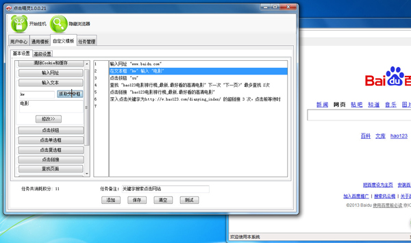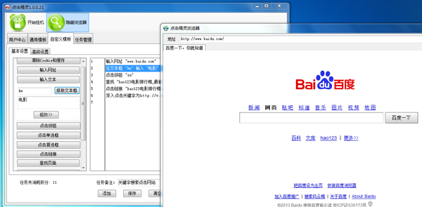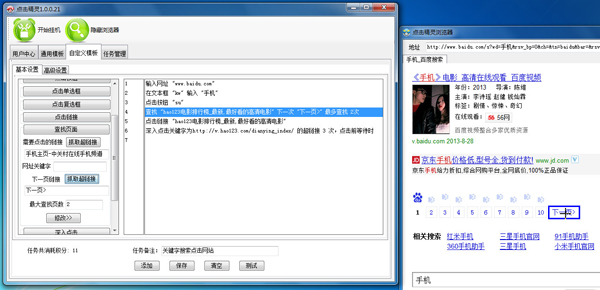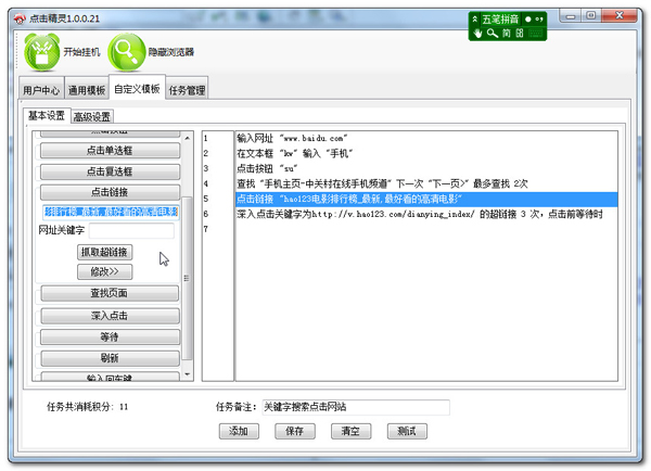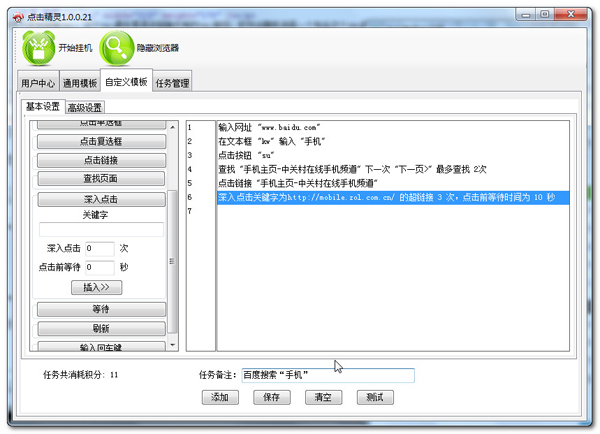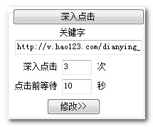 14、关键字是指我们要深入点击链接URL,这个URL最好是很多链接共有的URL前缀,软件会随机选择一个包含这个URL的链接点击。在次数里设置点击次数,在点击前等待时间里设置等待时间。