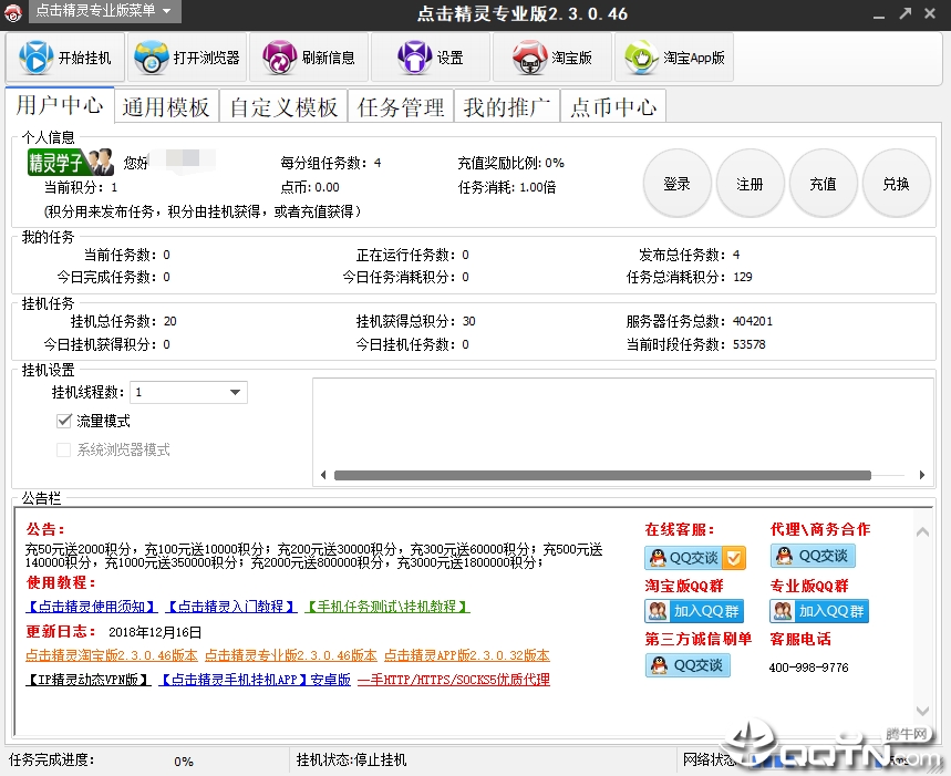 17、所有任务添加完后,我们要点“开始”,与众多网友一起分享流量。挂机所获取的积分,会自动用到您所添加任务上。