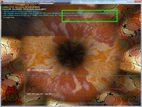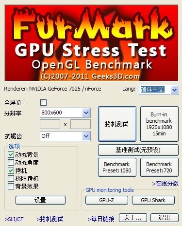 本来FurMark只是用来测试显示卡的OpenGL效能,但是因为他热力四射,火力非凡,所以可以拿来当烧机软件使用。它可以让显示卡跑出任何游戏都达不到的高温,以致于只要通过了FurMark考验过的显示卡,跑游戏都不会出问题。
