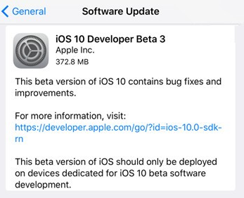 iOS10 Beta3可以由运行开发者预览版Beta1、Beta2(也是公开测试版Beta1)版本的iPhone、iPad和iPod touch通过OTA在线升级,没有安装Beta版本设备的需要先首先通过Safari一个描述文件(点此下载),需要注意的是你要删除之前已经安装过的其它描述文件,然后按照提示安装描述文件并重启手机,之后就应该会在设置中的系统更新中检查到“iOS10 Developer Beta 1”升级,之后再升级到后面最新的Beta版本。