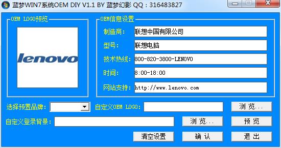 蓝梦WIN7系统OEM-DIY是一款为OEM系统用户制作的DIY工具,这款软件可以帮助用户修改系统OE息,你可以自由选择预置电脑品牌、自定义OEM LOGO、自定义登陆背景等等,预置品牌包括联想、三星、宏碁、惠普、戴尔、华硕、明基、方正、同方、东芝、康柏、LG等多达17款OEM信息。