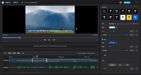 如果你想要更改字幕的字体、颜色、大小、透明度,甚至给字幕加边框、描边、阴影,或者更改字幕位置等,都可以在字幕大师内置的免费字幕编辑工具中直接修改。字幕大师还提供了丰富的字幕样式模板,只需要点击一下就可以轻松制作个性字幕,让你的视频字幕看起来更加炫酷。