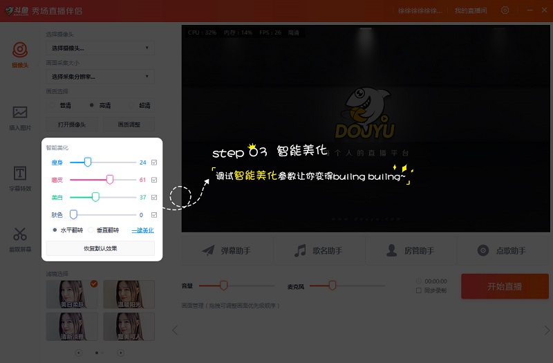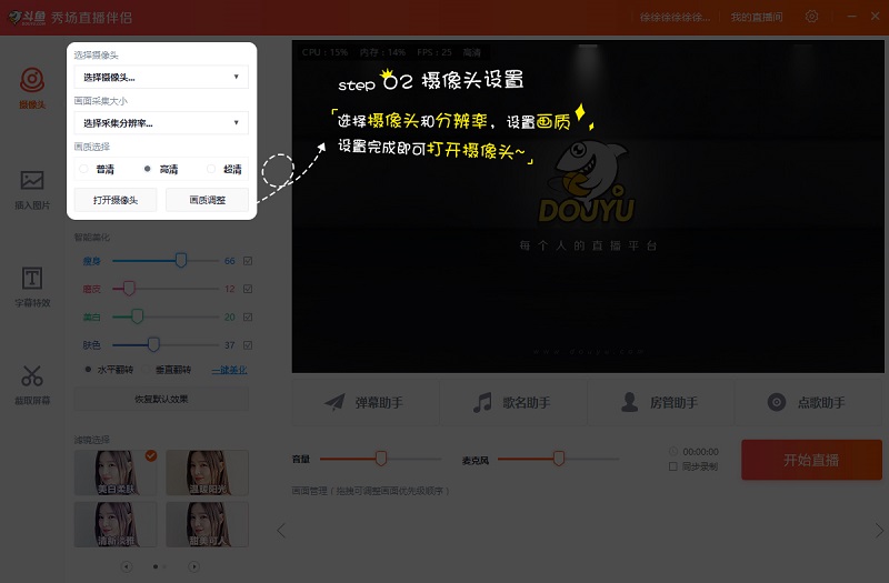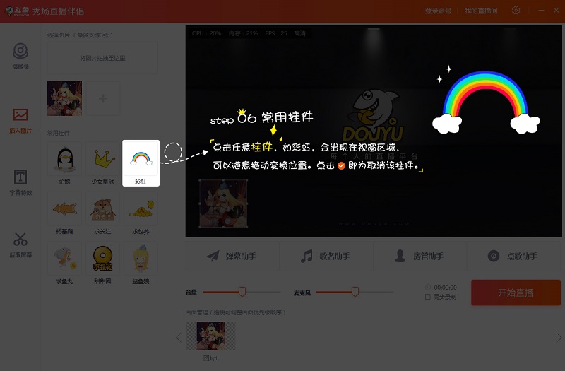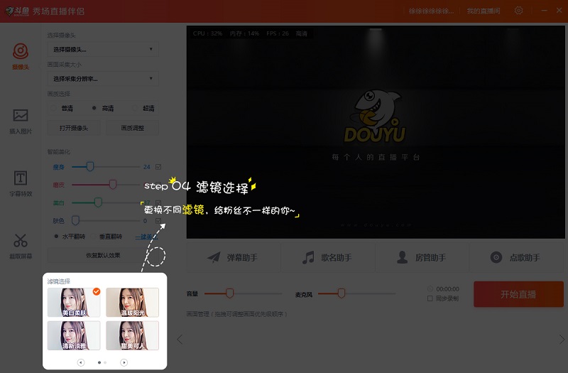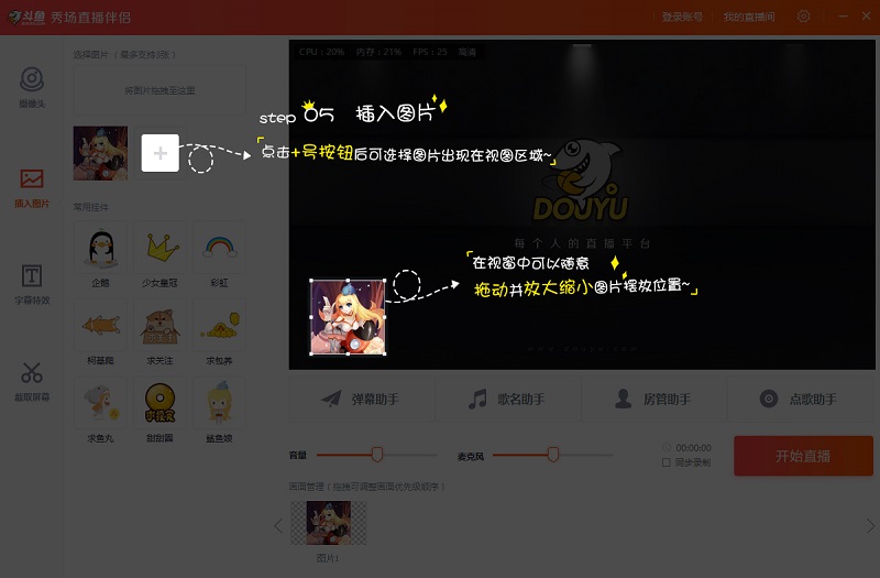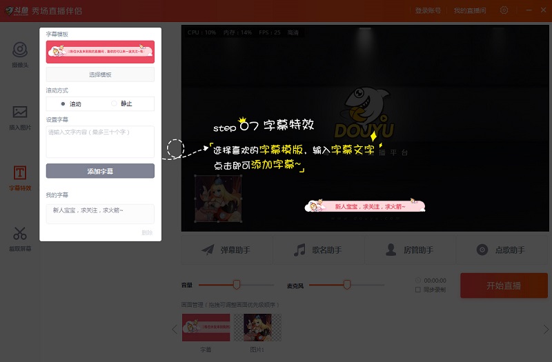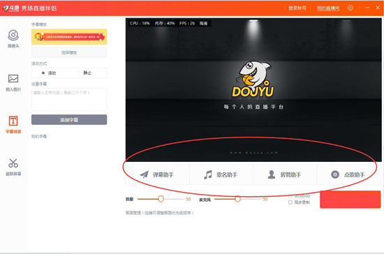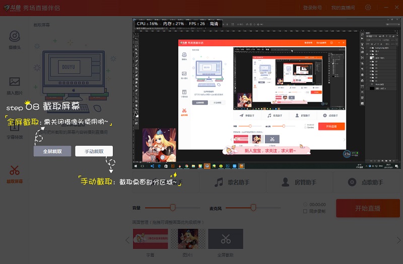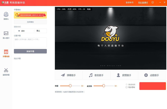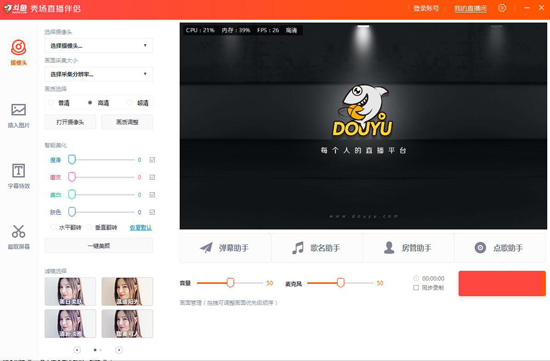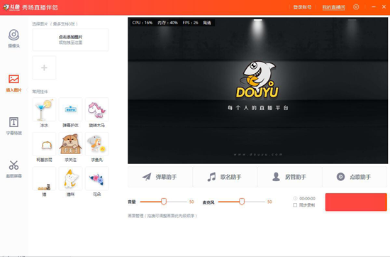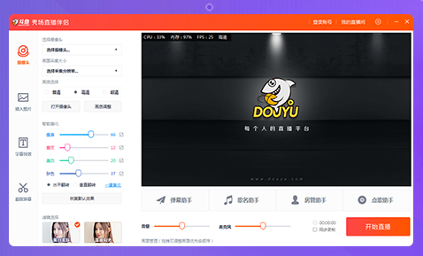 斗鱼秀场直播伴侣,是斗鱼为秀场主播们专门打造的直播工具,从摄像头到插入图片、再到字幕特效,到截取屏幕,制作出最好的直播场景,让主播们秀出自己、炫炸全场。