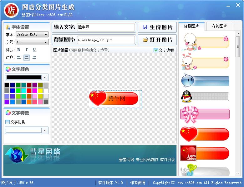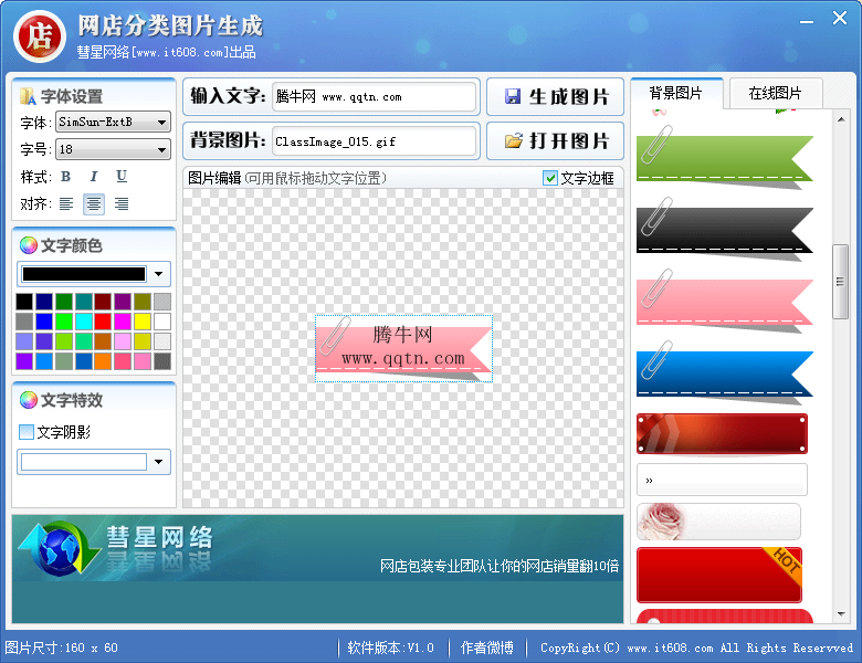网店分类图片生成软件,可用来生成淘宝网、腾讯拍拍、百度有啊等网店左边商品分类图片,让你的网店瞬间变得更漂亮,吸引更多顾客上门,快速提升网店成交量.本软件为绿色软件,不需要安装,解之后即可直接使用.