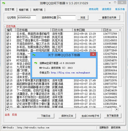 泪寒QQ空间日志下载器可将qq空间所以公开日志、照片以及文章等文件下载到本地备份,并导出为HTML等文件格式,用户可以快捷方便地备份qq空间所有文件,做到一键下载