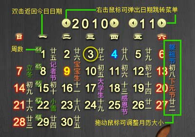 内含从公元1580-5000年的阴阳历,可查寻含阳历、阴历、天干地支(含2种算法)、二十四节气、九九三伏、月相变化等。透明度采用分层调节,确保与桌面背景良好的融合, 现在于Vista/windows7下可以完美嵌入桌面、可以在开启UAC保护时正常运行。