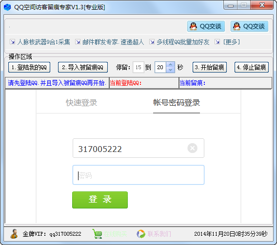 QQ空间访客留痕专家破解版是一款强大的空间工具。通过导入一些人气QQ,使用软件在人气QQ空间留痕,你就会获得大量空间用户回访,以实现QQ空间推广宣传的效果。软件采用了最新的协议,保证了留痕的效果。