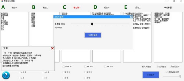 关键词批量生成软件是一款评论问答批量生成工具,通过导入匹配关键词,可以批量快速生成成千上万长尾词,能够生成大量关键词、标题等,是站长和自媒体从业者们吸引流量的好工具,有需要的用户不要错过了,欢迎下载使用!