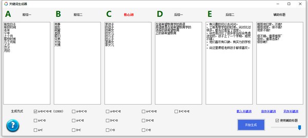 1、将要组合的关键词、内容录入到ABCDE等列中(一行一个,支持从表格或word等文本直接复制黏贴过来)