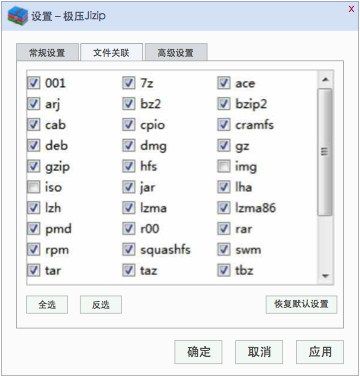 在极压软件主界面,点击logo进入【设置】界面,点击【文件关联】标签,勾选不同的压缩格式来更改软件默认的压缩格式关联,点击【确定】或【应用】即可。