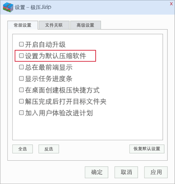 在极压软件主界面,点击logo进入【设置】界面,点击【常规设置】标签,勾选【设置为默认压缩软件】,点击【确定】即可。