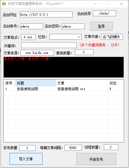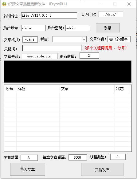 织梦文章批量更新软件是一款非常不错的网站文章批量更新软件,软件采用常规网站的文章更新模板,用户可以批量添加文本文件和L文件来进行文章自动更新,有需要的用户不要错过了,赶快来下载吧!