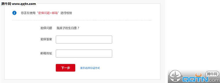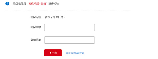 c.选择“密保问题+邮箱”,输入您的密保问题答案和账户绑定的邮箱地址,点击“下一步”