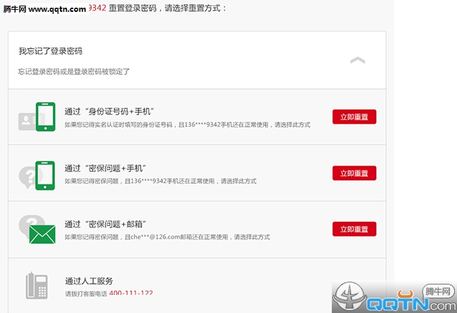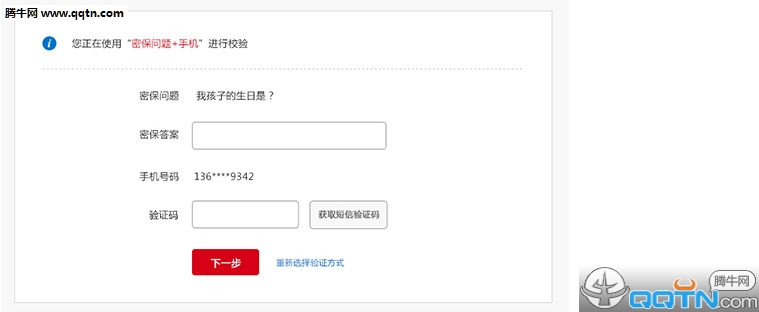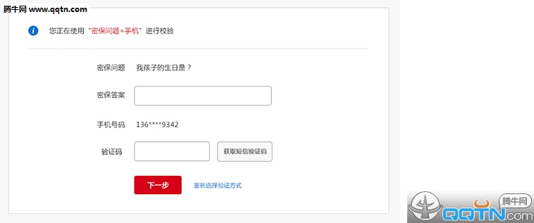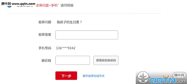 b.选择“密保问题+手机”,输入密保问题答案和手机验证码,点击“下一步”