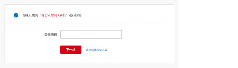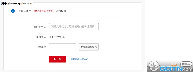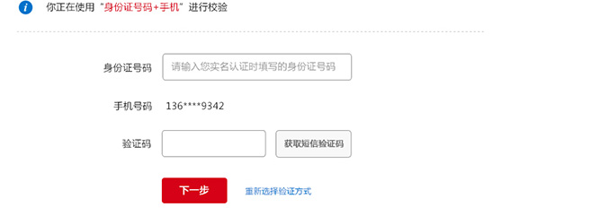 a.选择“身份证号码+手机”,输入您的身份证号码和手机验证码,点击“下一步”