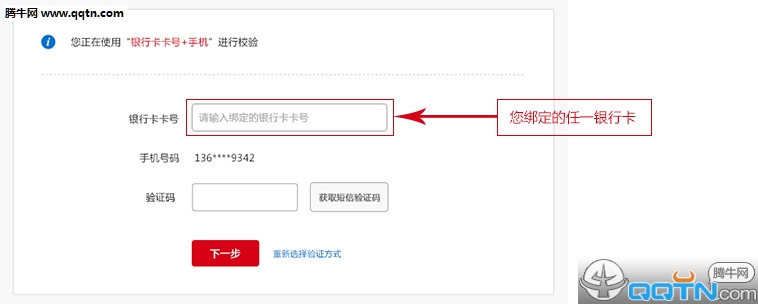a.选择“银行卡号+手机”,输入银行卡号(银行卡号需要是账户已绑定的银行卡)和手机验证码,点击“下一步”