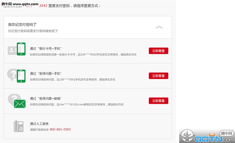 d.以上方式都不能完成支付密码充值时,您可以致电合众钱包客户服务热线 400-801-0505,完成支付密码的重置。