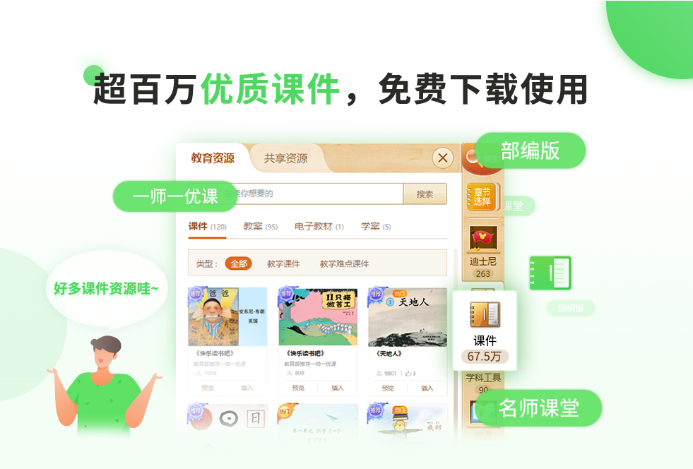 提供各学段、k12(小学一年级到高中三年级)语文、数学、英语等全学科、不同教材版本所需的课件、多媒体、习题、3D、VR等多种优质教学资源,备课更轻松。存储,随时随地管理文件。