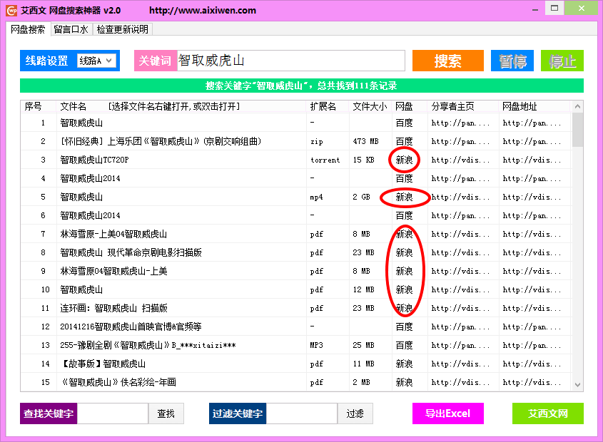 3、输出结果,不光支持百度网盘,还支持新浪,搜索完成后,可自行保存为Excel文档