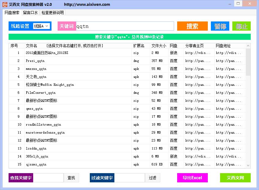 想在网上搜索一般人找不到的资源吗,那么来试试这款软件吧!艾西文搜索神器是一款超强的,它可以帮助你快速的搜索百度网盘内所有资源,艾西文网盘搜索神器支持关键词过滤,搜索结果可以导出为EXCEL,多线程、多线路查询,强大又方便,欢迎各位下载使用!
