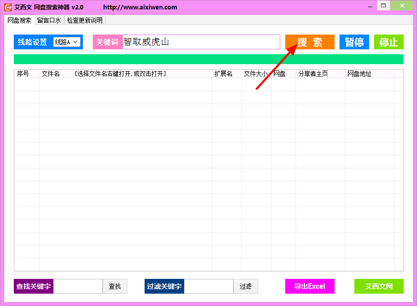 1、打开艾西文网盘搜索神器,设置需要搜索的关键词,以及线路
