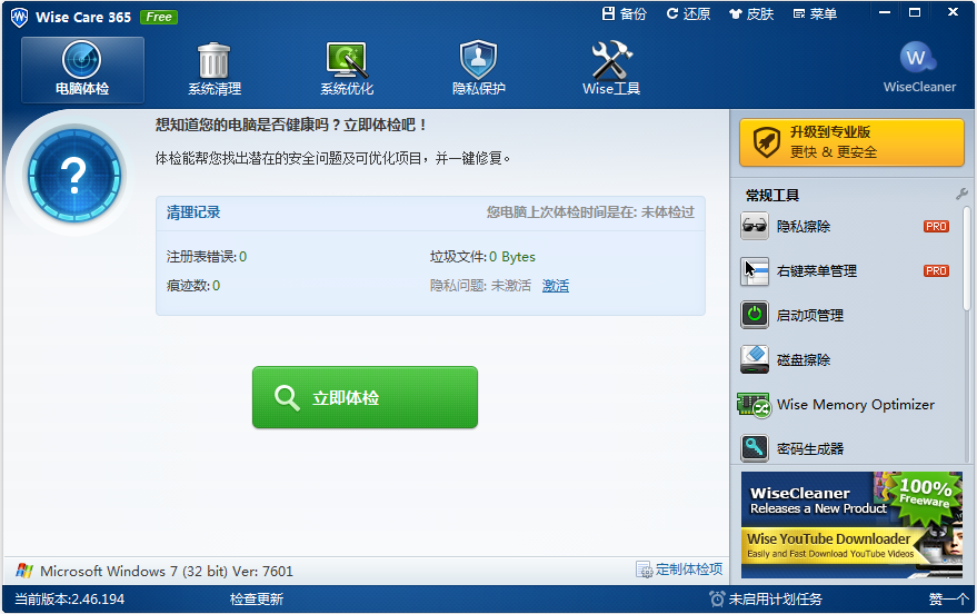 是由WiseCleaner公司推出的专业箱软件,除了提供了电脑体检模块可以执行对电脑的一键检测及修复任务外,还提供有系统清理、系统优化、隐私保护及Wise工具四个模块,分别用于帮助用户执行相关的电脑维护任务。