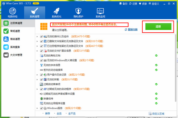 点击“系统清理”,注册表清理软件会快速的的扫描你的文件