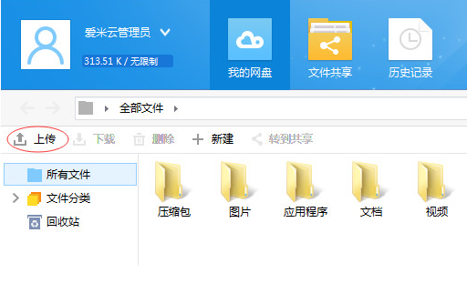 爱米云网盘中点击上传按钮,注意在文件分类和回收站中不能上传文件。
