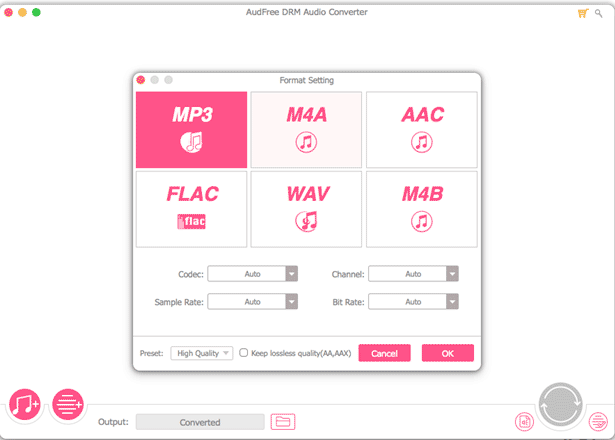 苹果音乐、iTunes M4P歌曲、有声读物和音响AA / AAX以及无版权音频文件可以转换到MP3、WAV、FLAC、AAC、M4A等格式。