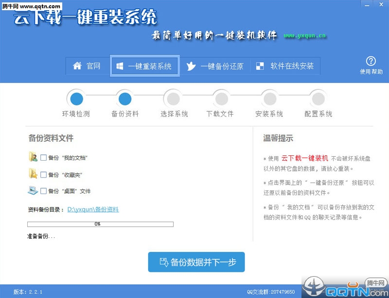 3、选中要备份的内容,点击”备份数据据并下一步“按钮,自动将文件备份到相应的目录下。