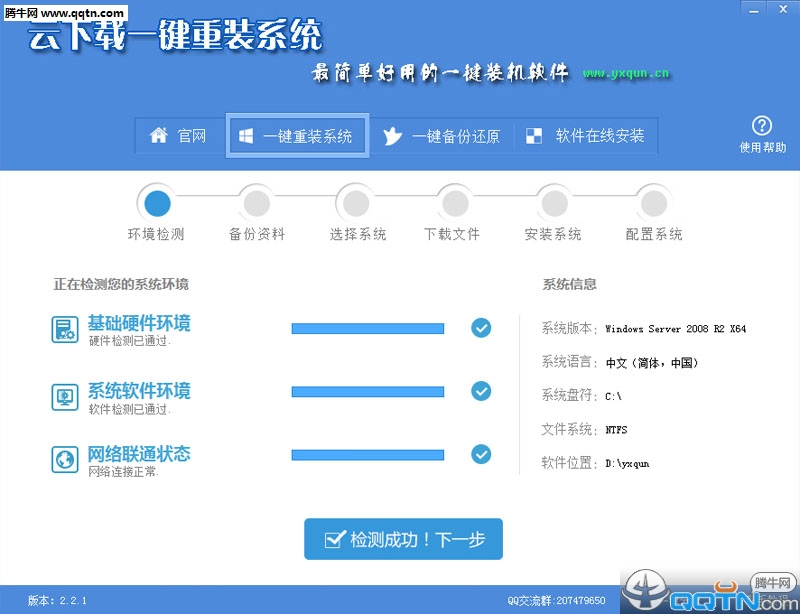 2、软件自动检测电脑软硬件环境以及电脑网络连通状态,完成后点击“检测成功!下一步”按钮。