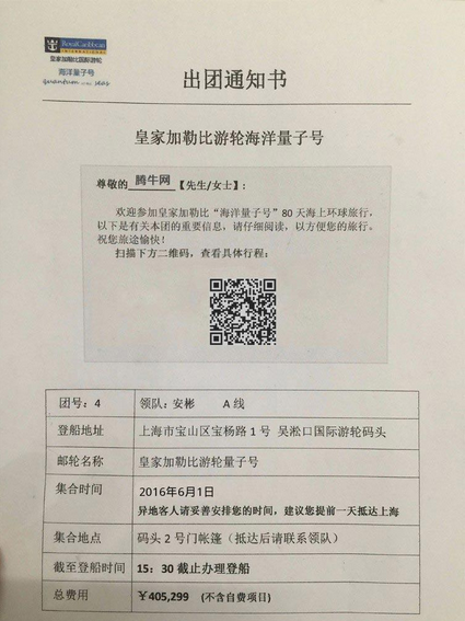 环球旅行出团书生成器可以免费在线生成一张来自环球旅行出团通知书,皇家加勒比游轮海洋量子号,一次长达80天的环球旅行。生成的图片非常逼真,只需输入你的名字就能轻松搞定生成。
