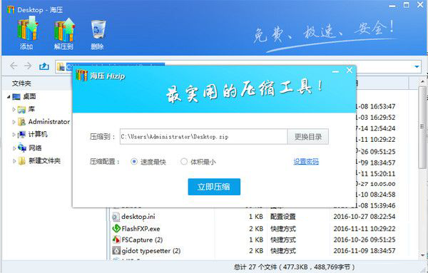 海压压缩永久免费使用,全面支持ZIP、r、7Z等40多种常用的压缩文件格式,并且完美兼容包括Win8、Win7、Vista、WinXP和Win2003在内的所有Windows系统,是您电脑必备的压缩工具。
