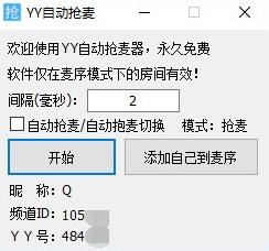 YY自动抢麦器是一款为准备的辅助工具。这款YY抢麦器可以帮助用户非常迅速的抢麦、抱麦,让用户第一时间就可以快速发言,喜欢的用户赶快来下载体验这款神奇的辅助工具吧!