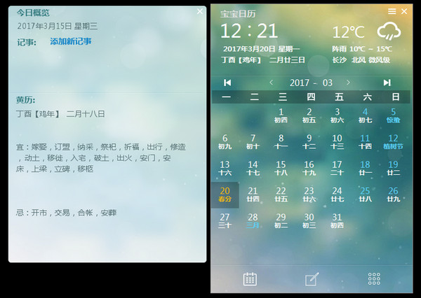 宝宝日历是一款pc电脑的桌面应用,所有的日历功能它全有,并有以及备忘录的功能,还能时刻显示最近几天的天气情况,让你的出行更加顺利。