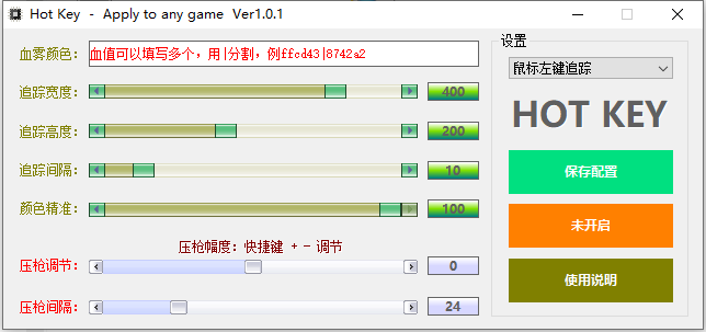 Hot Key万能血雾压枪是一款非常不错的通用鼠标压枪工具,支持找色追踪+压枪功能,让玩家在游戏中对拼时更加强力,为你提供稳定输出,并且绝对不会被检测到,有需要的玩家不要错过了,赶快来下载吧!