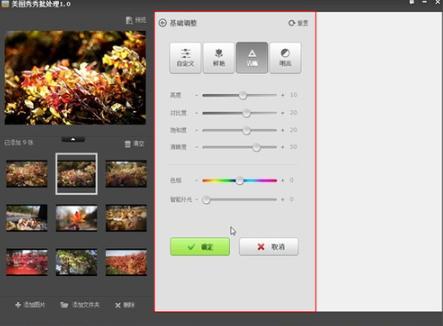 在批处理基础调整功能中,分为自定义模式和设定模式(鲜艳、清晰、明亮),即用户可以自定义微调各个参数选项,给予用户最大的自由度,随自己的修图喜好把握照片的风格;